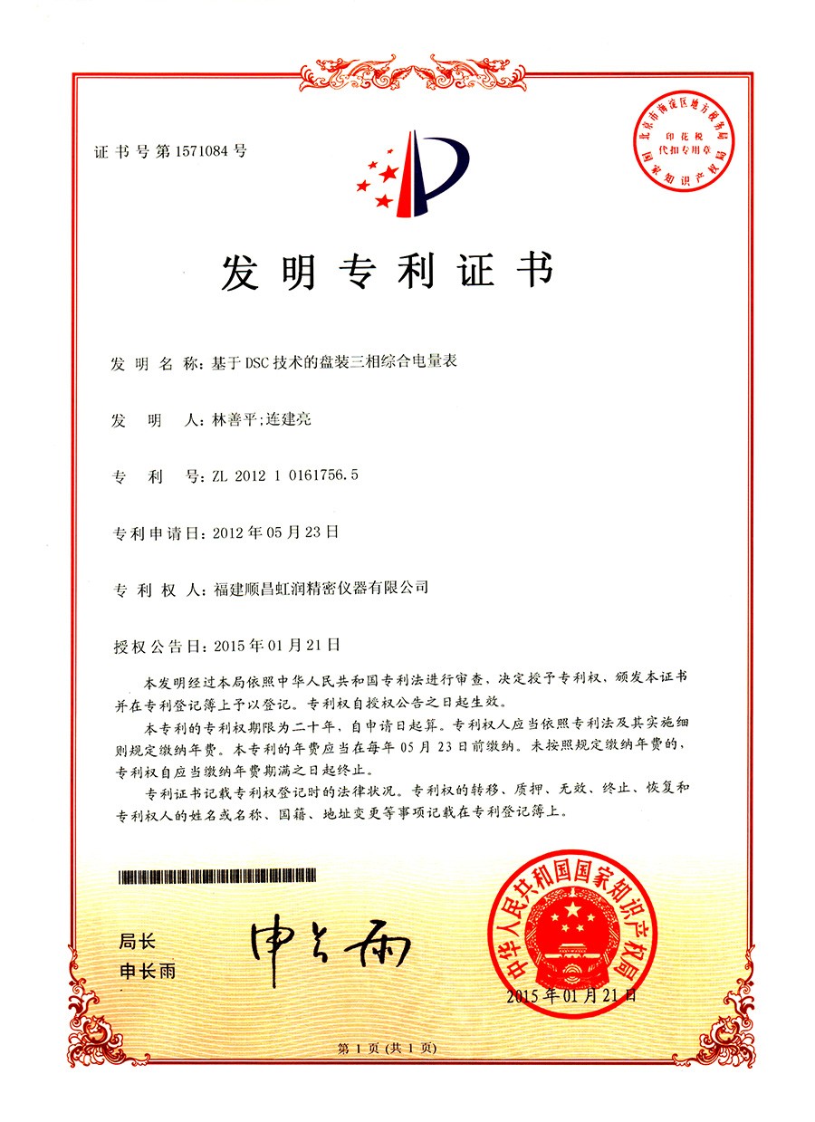 基于DSC技術(shù)的盤裝三相綜合電量表 發(fā)明專利證書 | 3300三相綜合電量儀表 軟件登記證書 |
