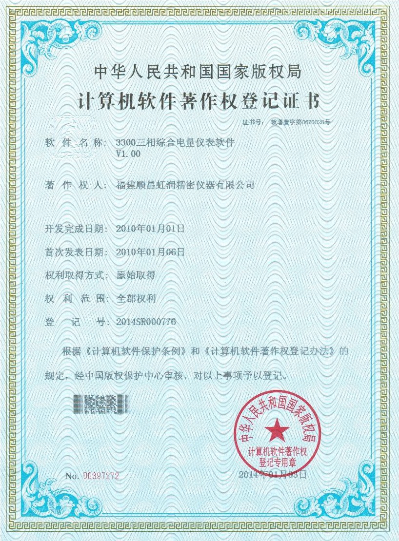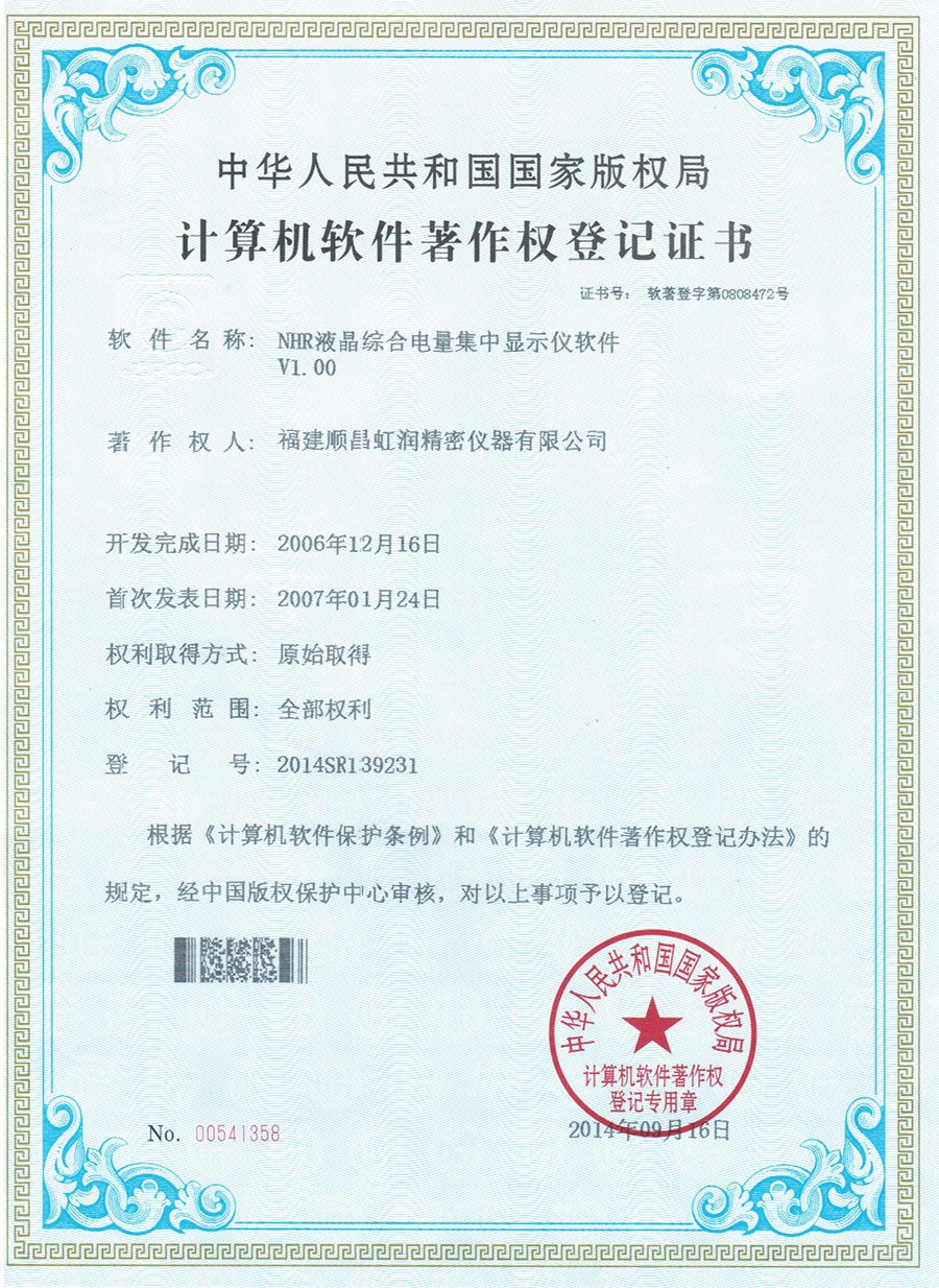 虹潤綜合電量顯示儀表是是一種用于交流電量綜合參數(shù)測量智能儀表。產(chǎn)品應(yīng)用公司自主知識(shí)產(chǎn)權(quán)開發(fā),榮獲基于DSC技術(shù)的盤裝三相綜合電量表(專利號(hào)2012101617565)國家發(fā)明專利,3300三相綜合電量儀表軟件V1.00(版權(quán)登記號(hào)2014SR000776)、NHR液晶綜合電量集中顯示儀軟件V1.00(版權(quán)登記號(hào)2014SR139231)、NHR單相電量儀表軟件V1.00(版權(quán)登記號(hào)2014SR165558)3項(xiàng)軟件著作權(quán)。