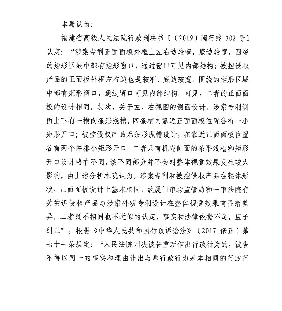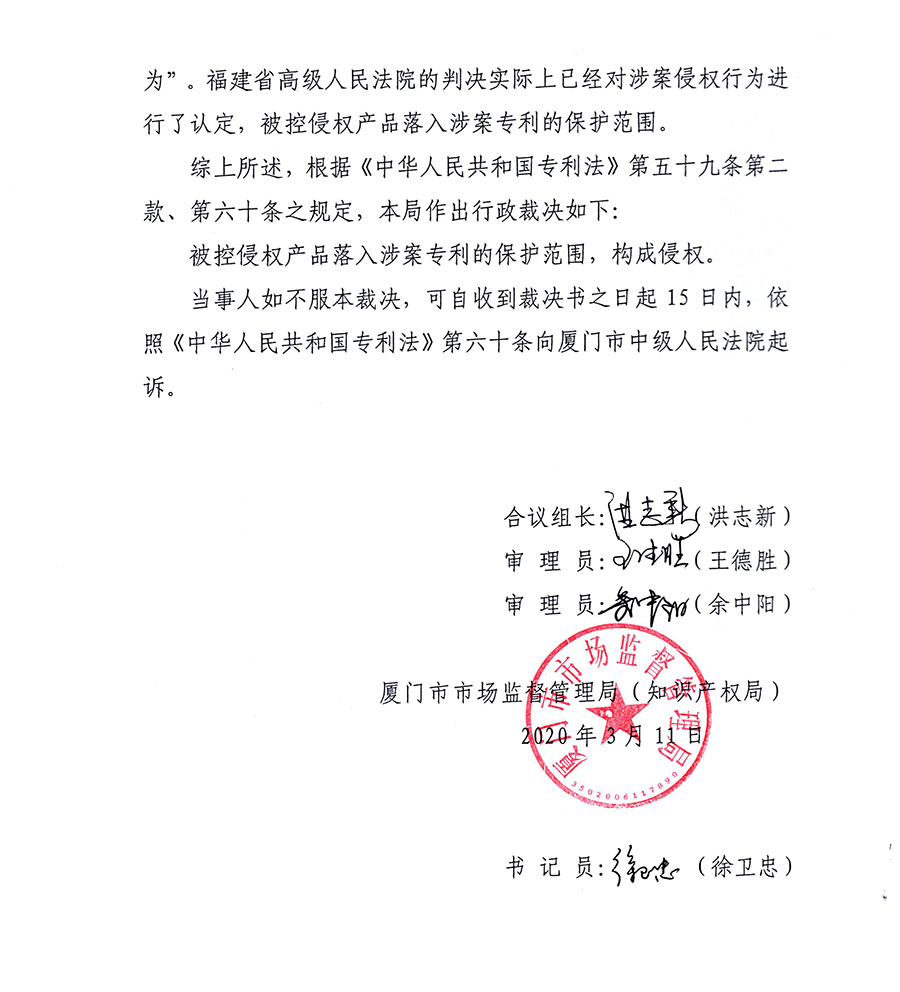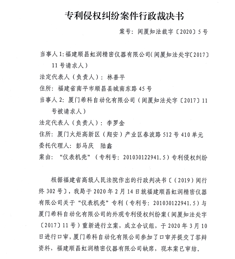 根據(jù)福建省高級人民法院作出的行政判決書[(2019)閩行終302號],廈門知識產(chǎn)權(quán)局于2020年2月14日就福建順昌虹潤精密儀器有限公司關(guān)于“儀表機(jī)殼”專利(專利號:201030122941.5)與廈門??谱詣踊邢薰就庥^侵權(quán)糾紛案(閩廈知法處字[2017]11號)重新進(jìn)行立案,于2020年3月10日作出審結(jié)裁決,認(rèn)定廈門希科被控的無紙記錄儀侵權(quán)產(chǎn)品落入涉案專利的保護(hù)范圍,構(gòu)成侵權(quán)。