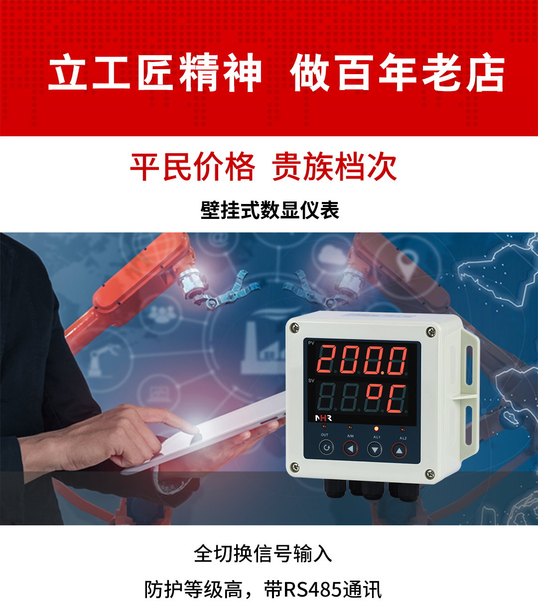 虹潤公司是專業(yè)生產(chǎn)數(shù)顯表的國家專精特新“小巨人”企業(yè),生產(chǎn)的壁掛式數(shù)顯儀表,具有全切換信號輸入,高抗干擾,IP65防護(hù)等級,全隔離設(shè)計,變送輸出或RS485通訊等特點。產(chǎn)品獲得巡回檢測顯示方法及裝置、工業(yè)模塊的導(dǎo)軌式安裝結(jié)構(gòu)等2項國家發(fā)明專利,主持起草工業(yè)過程控制系統(tǒng)用模擬輸入兩位或多位輸出儀表、物聯(lián)網(wǎng)智能溫度儀表通用技術(shù)條件等2項國家標(biāo)準(zhǔn),,以及通信系統(tǒng)多通道數(shù)據(jù)采集控制終端規(guī)范軍用標(biāo)準(zhǔn),參與國際5G標(biāo)準(zhǔn)制定,取得簡易數(shù)顯儀表等3項相關(guān)軟件著作權(quán)。產(chǎn)品廣泛應(yīng)用于電力、石化、冶金、化工、造紙、食品、輕工、制藥、熱處理、水處理、機(jī)械配套等各種工業(yè)現(xiàn)場。
