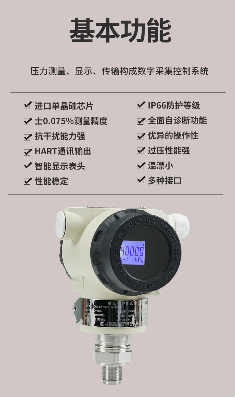 虹潤(rùn)公司是專業(yè)生產(chǎn)壓力變送器的國(guó)家專精特新“小巨人”企業(yè),生產(chǎn)的單晶硅壓力變送器,具有高精度,小溫漂,性能穩(wěn)定,帶HART通訊,抗干擾能力強(qiáng),自診斷功能等特點(diǎn)。產(chǎn)品獲得一種數(shù)字顯示低功耗壓力表、一種信號(hào)發(fā)生器裝置等2項(xiàng)國(guó)家發(fā)明專利,主持起草工業(yè)過程控制系統(tǒng)用模擬輸入兩位或多位輸出儀表、工業(yè)過程測(cè)量和控制系統(tǒng)用壓力/差壓變送器等2項(xiàng)國(guó)家標(biāo)準(zhǔn),通信系統(tǒng)多通道數(shù)據(jù)采集控制終端規(guī)范軍用標(biāo)準(zhǔn),以及現(xiàn)場(chǎng)設(shè)備集成等5項(xiàng)智能制造國(guó)家標(biāo)準(zhǔn)。參與國(guó)際5G標(biāo)準(zhǔn)制定,取得數(shù)顯壓力表等2項(xiàng)相關(guān)軟件著作權(quán)。產(chǎn)品廣泛應(yīng)用于化工、食品、制藥、電力、設(shè)備配套、供暖、水處理、樓宇等行業(yè),需精準(zhǔn)測(cè)量流體壓力的現(xiàn)場(chǎng)。