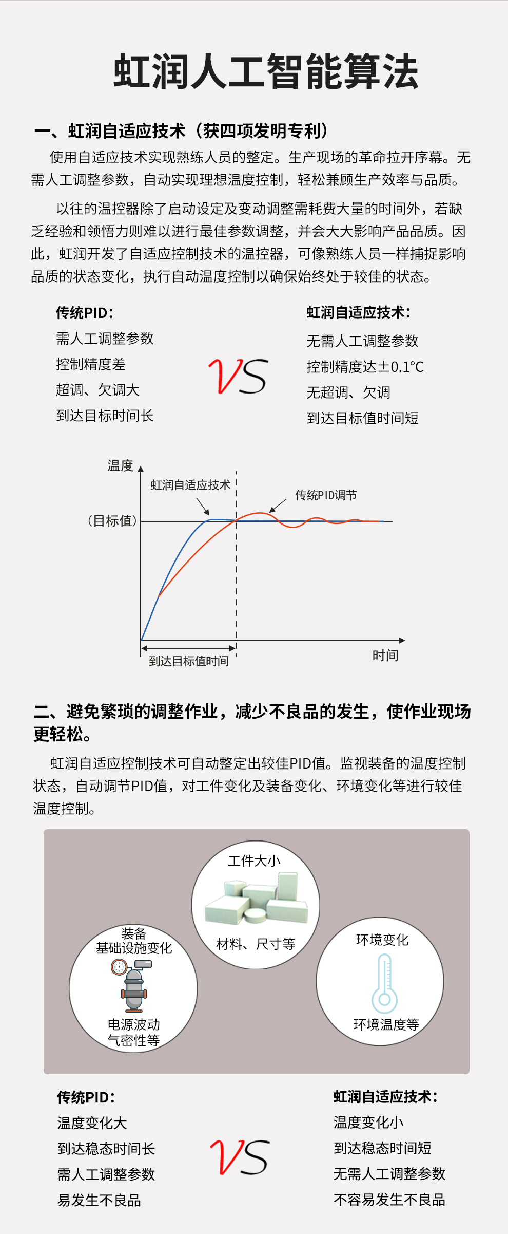 虹潤公司是專業(yè)生產(chǎn)無紙記錄儀的國家專精特新“小巨人”企業(yè)。生產(chǎn)的觸摸屏溫控器,具有觸摸大屏顯示,真正人工智能算式,無需人工整定參數(shù),控制精度達(dá)士0.1°C, RS485/以太網(wǎng)通訊,5/7/9英寸可選等特點(diǎn)。產(chǎn)品獲得智能化控制器、人工智能調(diào)節(jié)器及調(diào)節(jié)方法、模糊PID控制儀及控制方法、平板無紙記錄儀、巡回檢測(cè)顯示方法及裝置等5項(xiàng)國家發(fā)明專利,主持起草物聯(lián)網(wǎng)智能記錄儀表通用技術(shù)條件、物聯(lián)網(wǎng)智能溫度儀表通用技術(shù)條件、工業(yè)過程測(cè)量和控制系統(tǒng)用智能調(diào)節(jié)器等3項(xiàng)國家標(biāo)準(zhǔn),通信系統(tǒng)多通道數(shù)據(jù)采集控制終端規(guī)范軍用標(biāo)準(zhǔn),以及空間數(shù)據(jù)與信息數(shù)據(jù)傳輸系統(tǒng)等2項(xiàng)航天標(biāo)準(zhǔn),參與國際5G標(biāo)準(zhǔn)制定,取得觸摸屏彩色調(diào)節(jié)無紙記錄儀等3項(xiàng)相關(guān)軟件著作權(quán)。產(chǎn)品廣泛應(yīng)用于電力、石化、冶金、化工、食品、制藥、熱處理、水處理、機(jī)械配套等諸多領(lǐng)域。