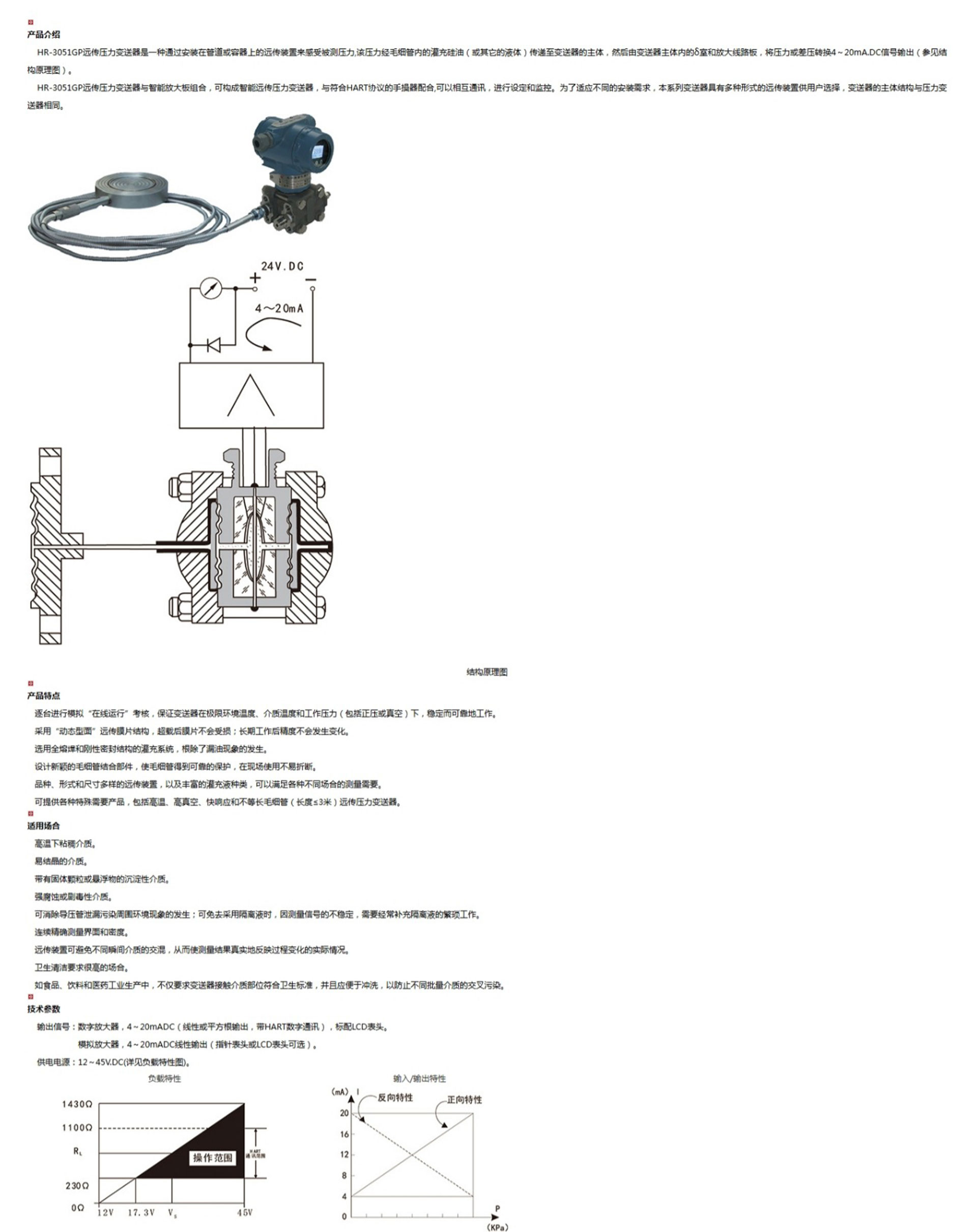 HR-3051GP遠(yuǎn)傳壓力變送器是一種通過(guò)安裝在管道或容器上的遠(yuǎn)傳裝置來(lái)感受被測(cè)壓力,該壓力經(jīng)毛細(xì)管內(nèi)的灌充硅油(或其它的液體)傳遞至變送器的主體,然后由變送器主體內(nèi)的δ室和放大線路板,將壓力或差壓轉(zhuǎn)換4~20mA.DC信號(hào)輸出。
