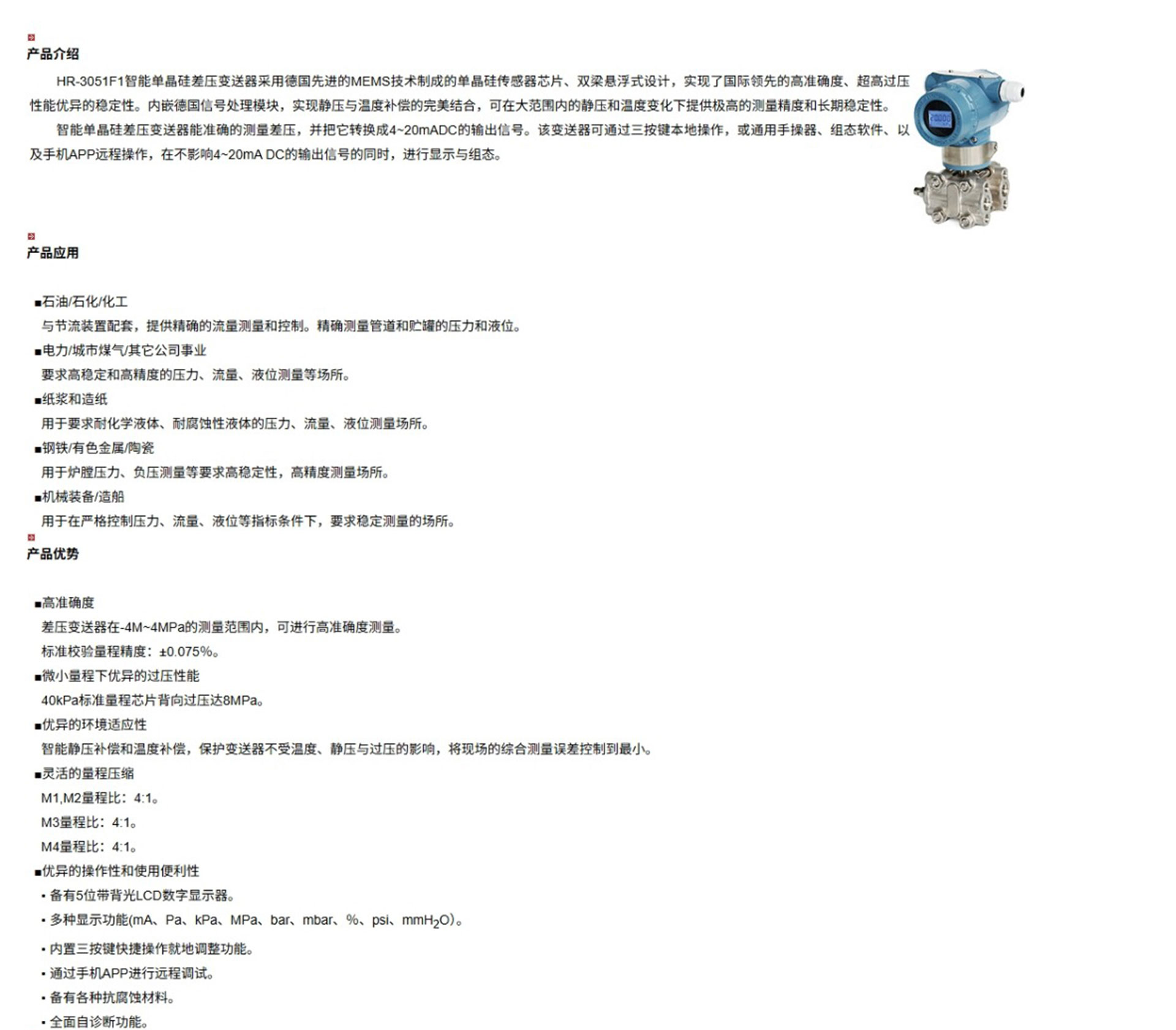 HR-3051F1智能單晶硅差壓變送器能準(zhǔn)確的測量差壓,并把它轉(zhuǎn)換成4~20mADC的輸出信號。該變送器可通過三按鍵本地操作,或通用手操器、組態(tài)軟件、以及手機(jī)APP遠(yuǎn)程操作,在不影響4~20mA DC的輸出信號的同時,進(jìn)行顯示與組態(tài)。